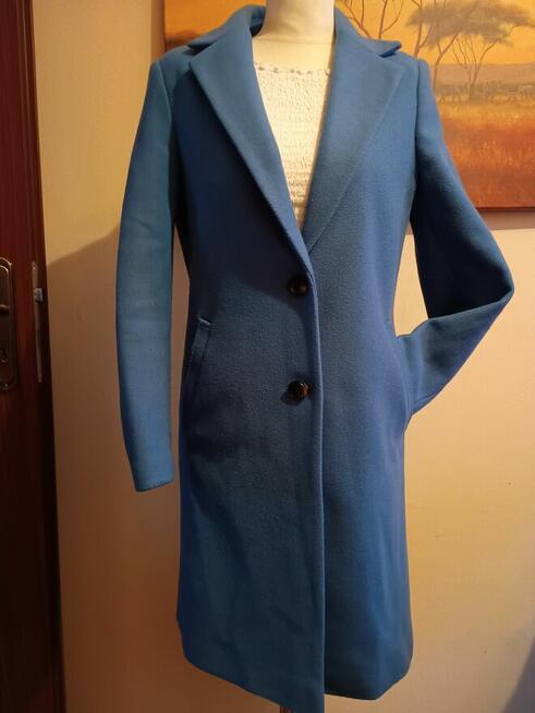 niebieski klasyczny płaszcz dł.94 cm dł.rek.60 cm szer.pod pachami 4 x2 cm pas 45 cmx2 biodra 48 x2 cm